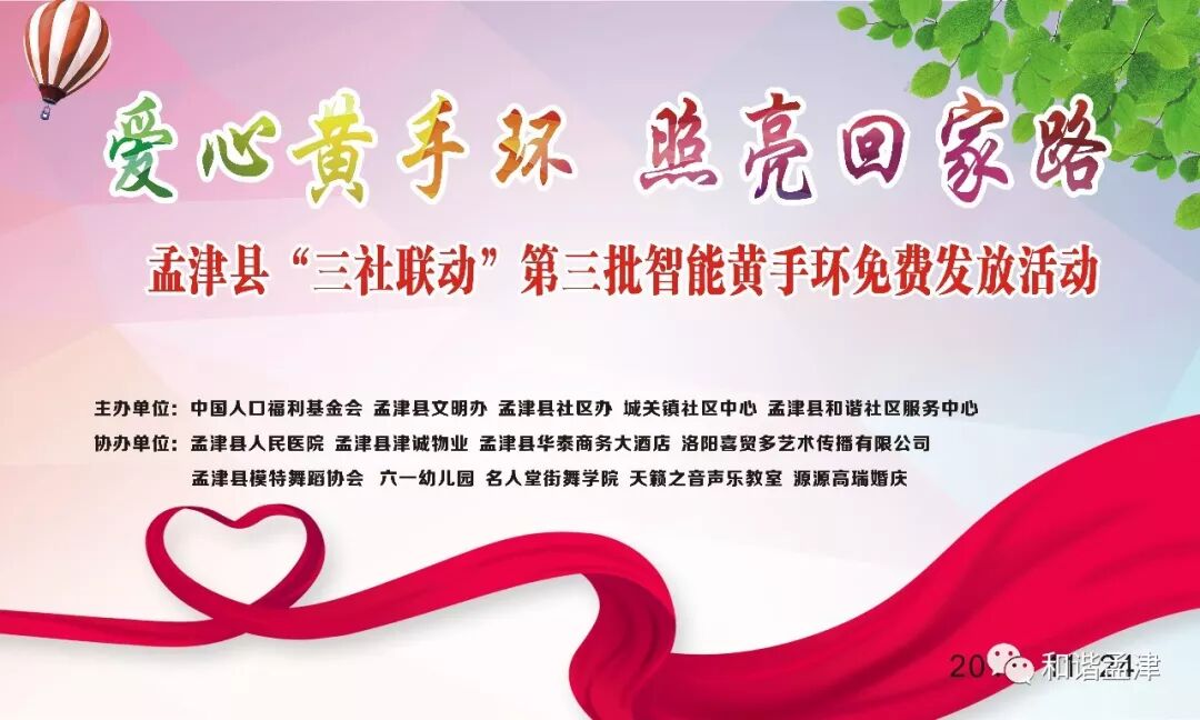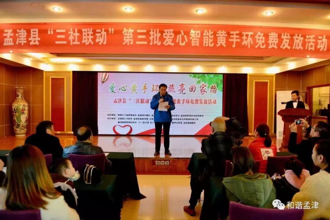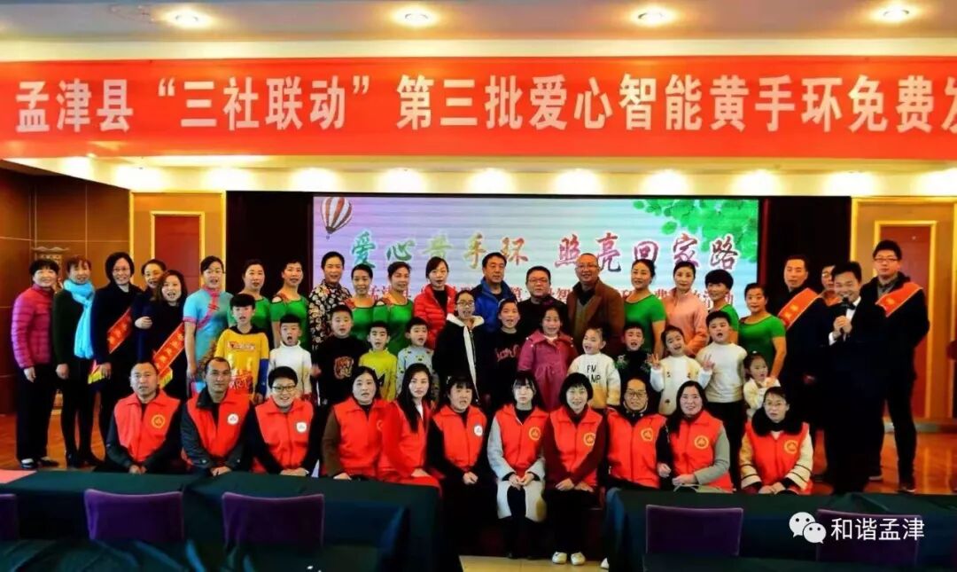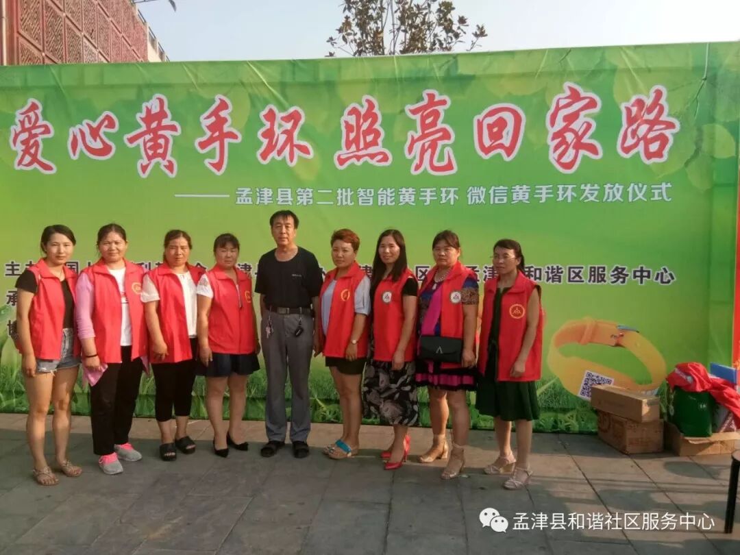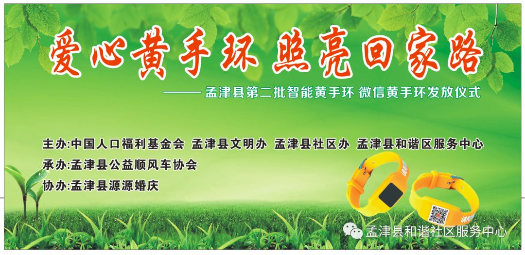 孟津县和谐社区服务中心承接“中国人口福利基金会”免费黄手环发放项目仍在进行中,目前已在孟津县域发放600支微信定位黄手环,200支智能定位手环。